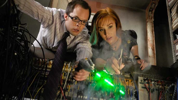 Claudia and Todd are together making out on the couch at the Bed and Breakfast. Claudia, excited that the warehouse is finally getting a computer upgrade, suddenly stands up and says she's late. Todd finds it strangely confusing that Claudia is so excited since he believes that the warehouse is actually an IRS facility. Claudia arranges to meet Todd later for lunch as she heads out to the warehouse. Meanwhile, Global Dynamics technician Douglas Fargo has come out from Eureka to upgrade the warehouse to 'class 7 standards' and, in the process, ends up infuriating Artie. Pete and Myka are busy filling out paperwork, and, after losing a quick game of rock, paper, scissors, Pete is made to step in and break up an ensuing argument between Fargo and Artie. Artie leaves with Pete, muttering that Fargo is a Global Dynamics nerd, and is 'made up of binary numbers'. Claudia arrives at the warehouse as Fargo tries to complete some soldering in the main IT well with his laser cutter, which he happens to drop into the IT well. Claudia uses Benjamin Franklin's Ring to add light and help find the cutter, before asking Fargo about his upgrade work, which includes fitting a new computer chip to replace all of the wiring in the IT well. He was going to add on MARA, a mechanical repair automaton, but Artie vetoed putting the machines into the system. Claudia replies "Artie would have vetoed fire if he'd been born just a few years before it was." With the upgrade completed, Fargo shuts down the old system, only to get into trouble when the system suddenly goes into lockdown. A camera rises up from the floor, and more pop up across the warehouse. Artie immediately blames Fargo, who insists it shouldn't have happened. At that moment a voice calls out that a catastrophic failure has been detected. After everyone takes a look around and Myka says that there are more of those "eye things" popping up all throughout the warehouse. When Artie demands that Fargo stop what's going on, Fargo discovers a failsafe is on the system. Artie keeps yelling at him and Fargo counters that he should have been warned that there was a failsafe. Artie says he didn't know there was one. Artie recognizes the voice that keeps warning them of a catastrophic failure as being that of Hugo Miller, the original Warehouse 13 computer technician, who had a lab in the warehouse. The team head down into the old computer lab, where Artie reveals that Hugo was brilliant and more than a little devious; apparently he'd pushed Steve Jobs at Apple in one direction while sending Bill Gates at Microsoft in another. Hugo retired to Hutchinson's Sanatorium in Featherhead, which Pete and Myka decide to visit in the hopes of learning how to deactivate the failsafe. Meanwhile, Claudia notices that the computer is downloading massive amounts of data from the mainframe. Fargo, trying to shut down the computer, is given a heavy shock when he presses one of the buttons on the panel. At that moment, a 3-D holographic projection appears, which Artie recognizes as being Hugo. The projection states that its name is Hugo One, and that it has detected a catastrophic failure. Hugo One then sets to work analyzing decades of warehouse information, leaving Artie, Fargo, and Claudia wondering what's going on. Pete and Myka arrive to meet the real Hugo. As they are waiting to get in to see him Myka talks about how every former warehouse agent they've ever known is either crazy, evil or dead. When they finally go in to meet him, they find out he's completely insane, solidifying her comment from moments earlier. She does point out that at least he’s not evil or dead. However, he still recognizes certain phrases such as 'catastrophic failure' - and still knows how to operate a Tesla, as they soon learn when Hugo steals the one tucked the back of Pete's pants and fires it at them, knocking them both completely out. Pete and Myka come to, and let Artie know that they're going to have to find Hugo, who has apparently escaped from the sanatorium for the first time since he arrived. Myka remembers what Hugo said about 'the spinning and the dancing' and says she knows where to find him. They manage to track Hugo down watching an old merry-go-round in Featherhead. The calmer Hugo says it isn't working the way did before, something that neither Pete nor Myka understand. Pete handcuffs Hugo for his own safety, and they begin the journey back to Univille and to the warehouse, where Hugo One has finished his investigation. Artie, Claudia, and Fargo are surprised that Hugo One has reviewed their personnel files. Fargo is especially shocked, since he's not a warehouse employee, but from Global Dynamics. To his consternation, Hugo One points out that his file includes the phrase "inappropriately pushed button" 38 times. Claudia has six infractions against her (she says she thought it'd be more) and Artie continuously breaks the rules. After reviewing the files, Hugo One has decided it's the agents who are the problem and responsible for the issues. Before they can react or try to reason with the A.I., all of the security doors slam down, locking them in the warehouse. Claudia gets a call from Todd asking where she is for their lunch date, and she says she's not going to be able to make it, though she’s unable to elaborate on why she can’t be there. When Fargo asks who it is, she tells Fargo it's nobody, which Todd hears and questions her asking her about why she would say he's nobody. He asks who she's talking to at the warehouse and she again replies "Nobody" to which Fargo takes offence this time. Frustrated, Claudia starts to tell Todd she'll talk to him later when Hugo One cuts off the call. She tells Fargo that Todd is a "guy friend, nothing serious." Hugo One announces he has activated the Falcon-Scott Protocol, lowering the temperature inside the warehouse to preserve the artifacts but the process will kill anyone who's still inside the warehouse. Frigid air begins to get pu
